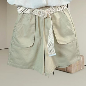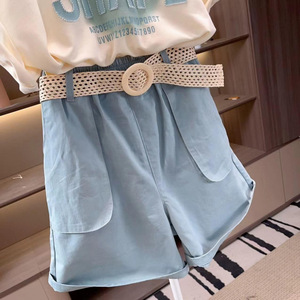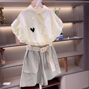2025夏款女童工装短裤新款儿童夏款米杏色爱心短袖衬衫大童套装潮