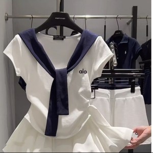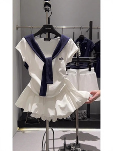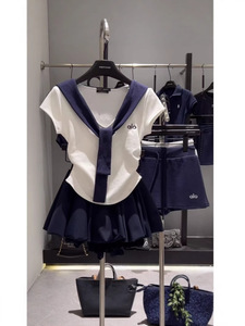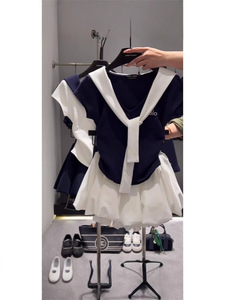 夏のウエスト痩身トップコントラストカラー V ネックネイビーフェイクツーピースショール Tシャツクラウドふわふわスカートスーツ女性用
