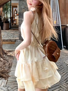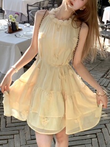 グレープフルーツスパークリングウォーター/ミルクイエローホルターネックドレス夏フレンチチュールショートスカートドールスカート妖精