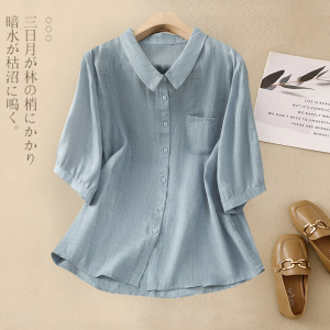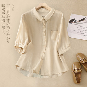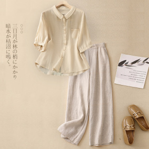 中年女性・お母さん向けの大きいサイズの夏服、カジュアルな綿麻スーツ、おしゃれな高級アシル麻シャツ、お腹カバー2点セット
