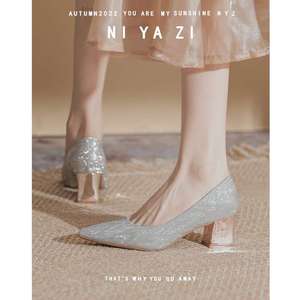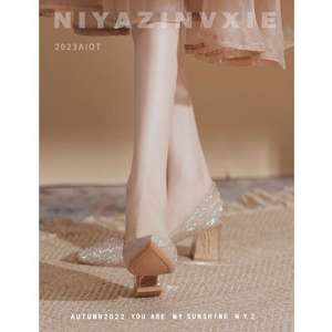 女性用のシャンパンカラーのウェディングシューズ、厚いヒール、足が疲れにくい、スカート付きのブライズメイドシューズ、婚約パーティー、ポインテッドトゥのハイヒール