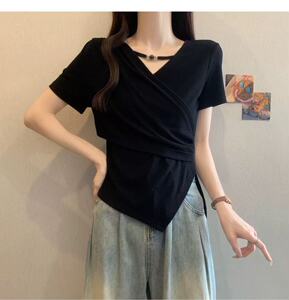 グリーン不規則なVネック半袖Tシャツレディース2025年夏新作ウエスト痩身ニッチ美しいシックなショートトップ