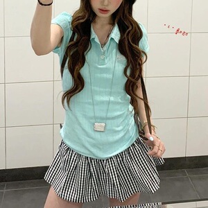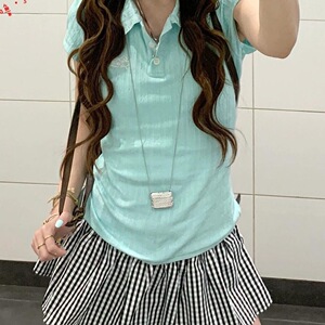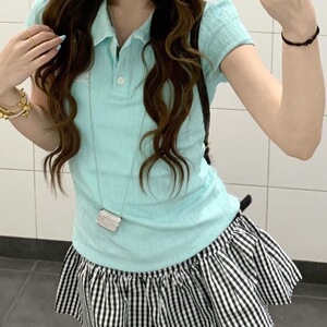 スリムレディースショートトップ右肩ホットガールスリムインカレッジスタイルTシャツポロカラー半袖夏