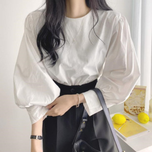 春先フレンチレトロファッションシンプルデザインプリーツパフスリーブラウンドネックプルオーバーシャツトップ