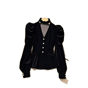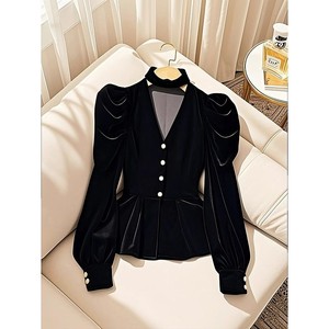 Xiaoxiangfeng 黒ベルベット長袖シャツ女性の 2025 初春の新しいホルターネックフレンチユニークな美しいトップ