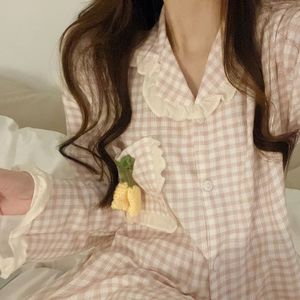 インス風甘いチェック柄笑顔小花パジャマ女性用春秋新作シンプルウェアラブル長袖日本製ホーム服