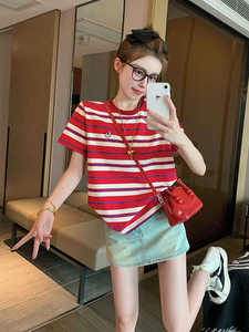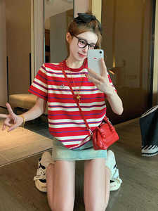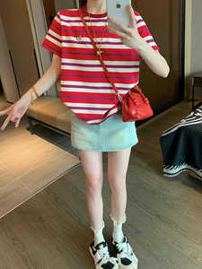 [綿95、スパンデックス5]レッドストライプ半袖Tシャツレディース2025新作レトロルーズカジュアルショルダー刺繍