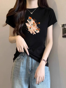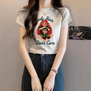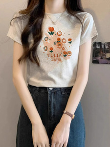 デザインニッチな右肩ピュアコットン半袖Tシャツレディース夏新作プリントスリムラウンドネックグレートップトレンディ