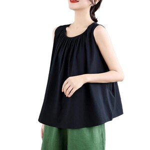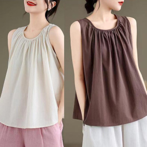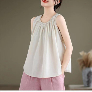 コットンとリネンのベストシャツ、純綿のベスト、夏の新しいスタイルのプリーツノースリーブカジュアルルーズデザイン、多用途のサスペンダートップ
