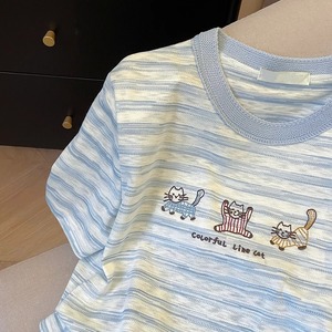 韓国スタイルのコントラストストライプ漫画刺繍半袖Tシャツ、女性用夏デザイン、年齢を軽減する、ゆったりとしたカジュアルで多用途なトップス