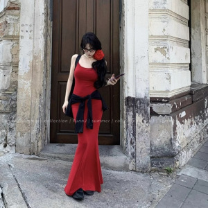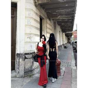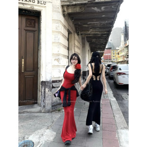ホットガール中空エッセンスドレス美神ダジサスペンダーミッドレングスバタフライウエストサマーロングスカートバックレススリムフィット