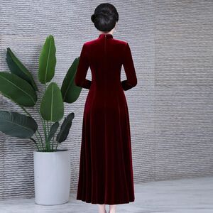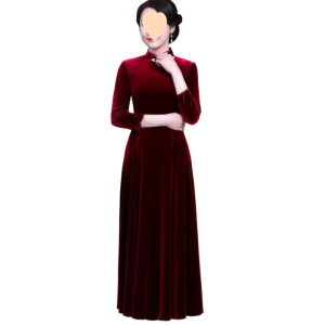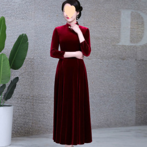 金丝绒旗袍春秋冬高档气质绣花连衣裙复古中老年妈妈装宽松大摆裙