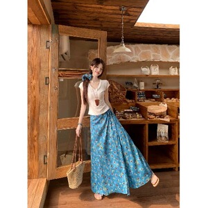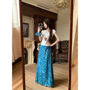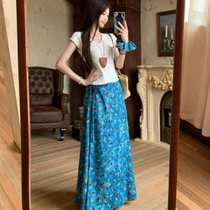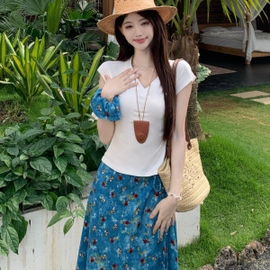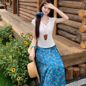 ファッションスーツ白 V ネック半袖 Tシャツ女性の夏のハイウエスト痩身花柄スカート 2 点セット