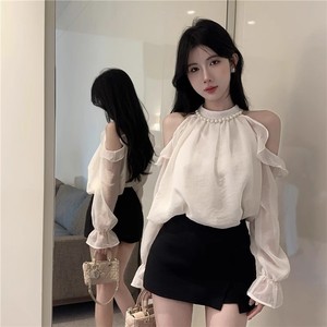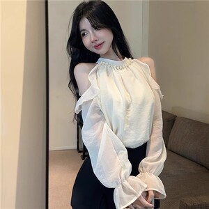 フレンチパールホルターネックオフショルダーシフォンシャツレディース春トランペット長袖ゆったりおしゃれ年齢軽減トップス甘いシャツ