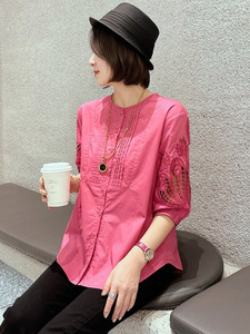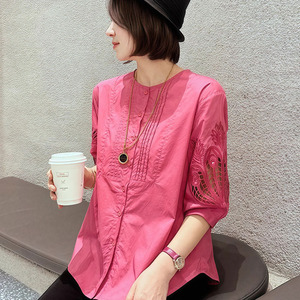 中空刺繍七分袖白シャツ女性用 2025 夏の新スリムコットンシャツ気質年齢軽減トップ女性用
