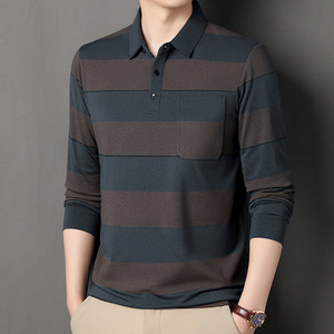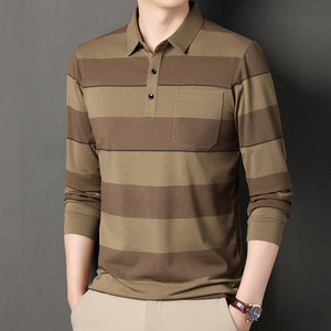 2025年春季翻领条纹长袖T恤男休闲宽松男士T恤舒适透气上衣