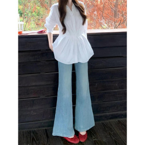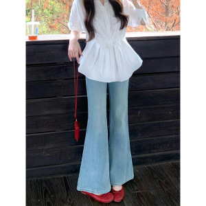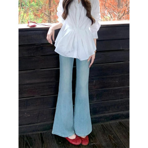 女性のためのライトブルーマイクロフレアジーンズ夏の新しいハイエンドスリムワイドレッグスリムストレート馬蹄ロングパンツ