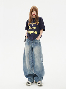 アメリカンレトロワイドレッグジーンズ女性秋ハイウエストストレート梨型ボディルーズシルエット鎌パンツスモールパンツ
