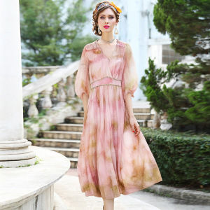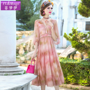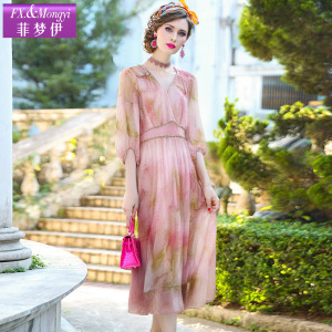 [Feimengyi] 100 マルベリーシルクプリントドレスレディースサマーウエストビーチバケーションスカート