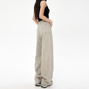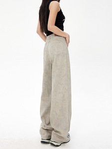 アメリカンタイダイプリントハイウエストデニムパンツ レディース 2025年秋 ゆったり着痩せ 小柄さん向け ストレート ロング丈 ワイドパンツ