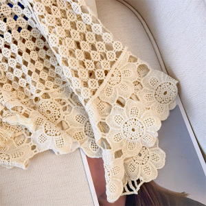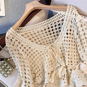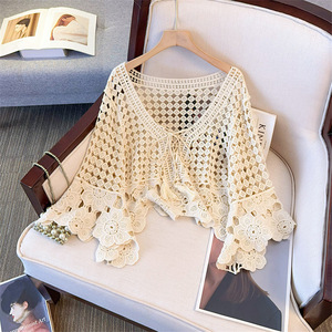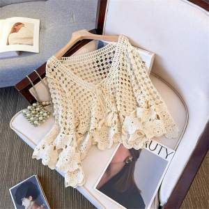 波西米亚风钩花镂空针织罩衫女春夏大码胖mm法式短款别致上衣 596