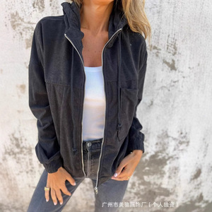 独立したステーションクロスボーダーホットセール秋の新無地ジャケット女性のためのヨーロッパとアメリカのシンプルなスタイルのコーデュロイフード付きジャケット女性のための