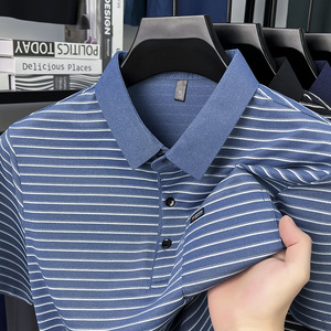 夏の新中年男性半袖ポロシャツファッションカジュアルストライプ薄い Tシャツトップリアルポケット紳士服