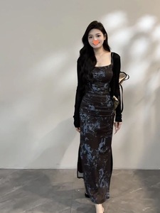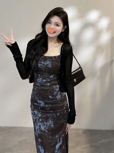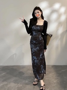 高級インク染めレトロドレス2025新作夏デザインスリットヒップカバーサスペンダースカートツーピーススーツ