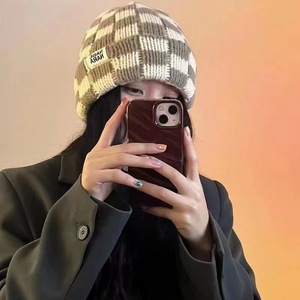棋盘格针织帽女秋冬季韩版小众大头围毛线帽日系显脸小圣诞帽跨境