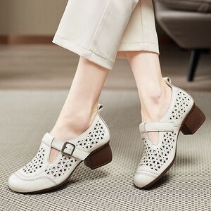 春夏新款软皮防滑镂空妈妈凉鞋中年鞋子粗跟洞洞鞋软底防滑单鞋女