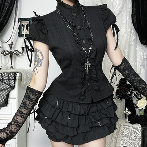 CF25132 サブカルチャースタンドカラー半袖テクスチャードシャツ夏の新しいスタイルの木耳スプライシング多用途トップ女性用