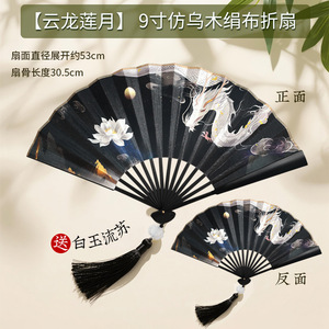 【雲龍蓮月】9inch 模造黒檀模造黒絹扇子