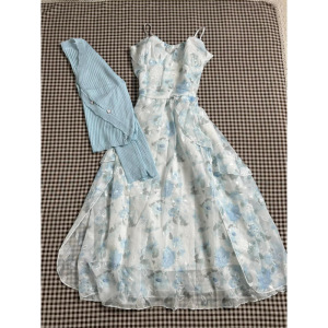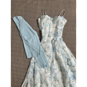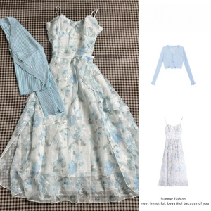 女性のための小さな新鮮なシフォンジャカードサスペンダードレススーツ夏薄い日焼け止めカーディガンフリルウエストロングスカート