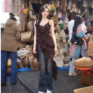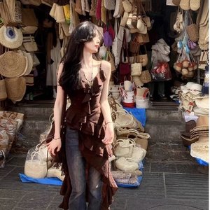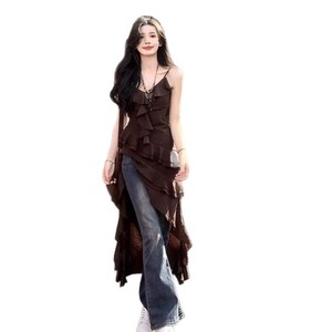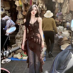 フレンチレトロスタイルドレス2025新作夏デザイン不規則なフリルサスペンダーミドル丈スカートシンプル