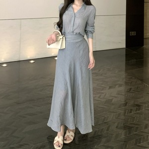 カーキレトロ気質Vネック長袖シャツレディース夏カジュアルスーツハイウエストAラインスカートツーピースセット