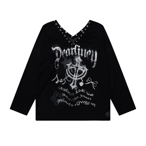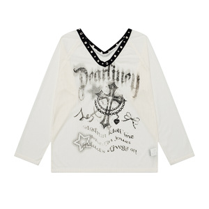 美式复古镂空涂鸦宽松t恤女2025夏季大V领防晒罩衫薄款长袖上衣潮