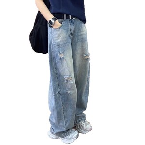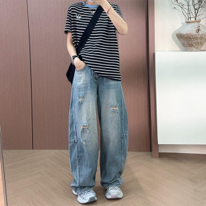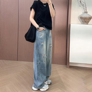 大码破洞阔腿牛仔裤女2025新款夏季薄款胖mm显瘦宽松直筒弯刀裤子