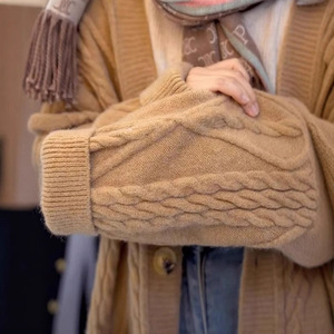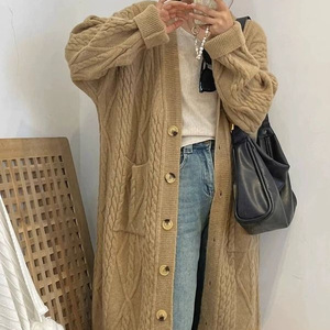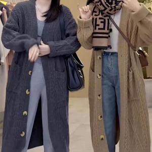 2025 ミドル丈膝上レイジーカーディガンセーター秋ツイスト新ポケットセーターアウターコート