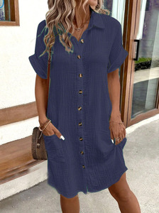 2025年速卖通wishアマゾン夏シンプルVネックボタン付き綿麻ワンピースレディースシャツワンピース半袖