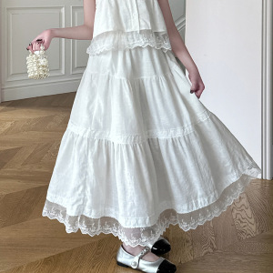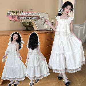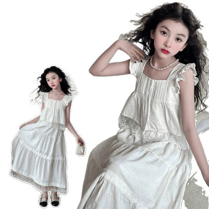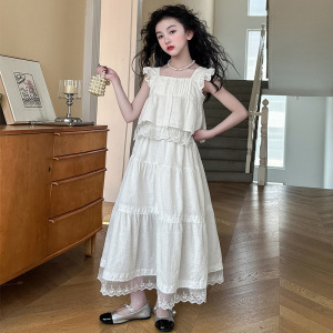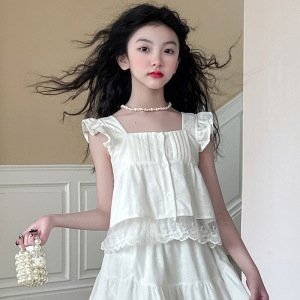2025新款女童夏季套装儿童洋气蕾丝上衣白色长裙大童半身裙两件套
