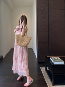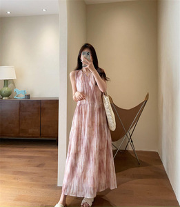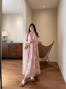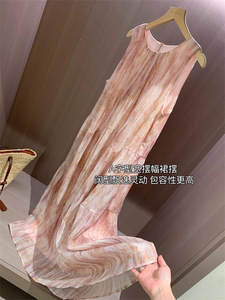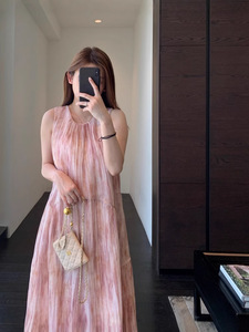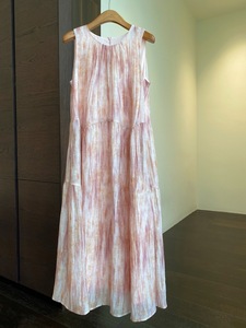 フレンチロマンティックピンクタイダイプリーツテンセルタンクトップミドル丈ノースリーブドレス2025夏