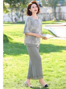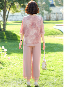 中年妈妈夏装减龄套装新款中老年短袖T恤女洋气时尚阔太太冰丝衫