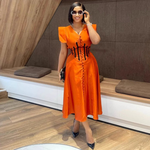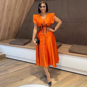 ヨーロッパとアメリカの女性の気質フライングスリーブハイウエストスリムドレス女性のアフリカのVネックロングシングルブレストロングスカート夏