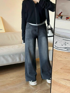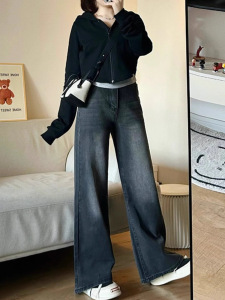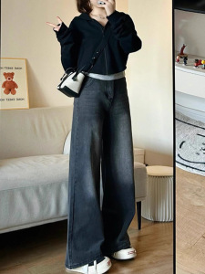 秋の女性用ウォッシュドブラックワイドレッグジーンズ、新しいファットmmレトロハイウエストルーズスリミングフロアレングスストレートパンツ