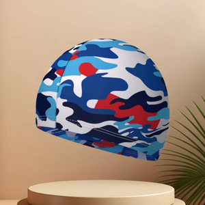 夏を楽しむ:ブルーの迷彩柄はユニセックスで落ちません - ファッショナブルなプリントの通気性のある布製スイミングキャップは伸縮性が高く、通気性があり、頭を締め付けません。