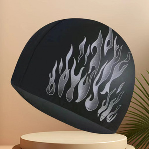 夏を楽しむ:黒と青の火のユニセックスは落ちません - ファッショナブルなプリントの通気性のある布製スイミングキャップは、伸縮性が高く、通気性があり、頭を締め付けません。