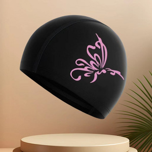 夏を楽しむ:黒の背景のピンクの蝶はユニセックスで落ちません - ファッショナブルなプリントの通気性のある布製スイミングキャップは、伸縮性が高く、通気性があり、頭を締め付けません。
