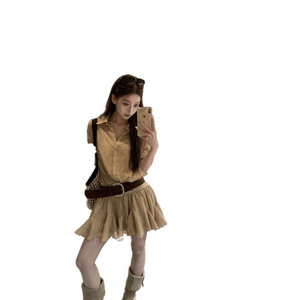 2025 新しい夏の女性のワークウェアスタイルデニムカーキフェイクツーピーススプライシング半袖シャツプリーツジャンプスーツショートスカート