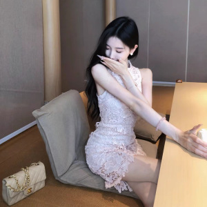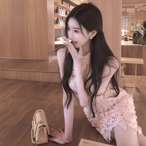 DFAY カスタム染めパウダーレーススカート、エレガント、優しく、美白、ヒップカバー、スリム、夏の女性用ノースリーブスカート