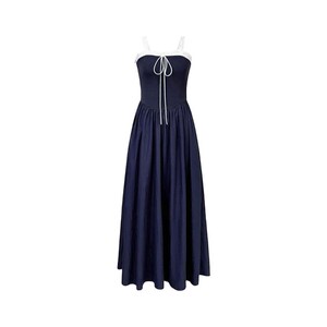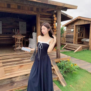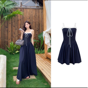 韓国kumikumiレーススプライシングサスペンダードレスレディース夏の新しいスタイルで肉をカバーしてスリムに見えるリボンロングスカート